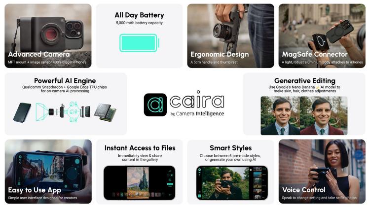 海外科技媒体petapixel报道中玉束哈,Camera Intelligence公司专为iPhone手机设计了一款名为Caira的相机配件。设备融合了实时AI编辑功能,专为独立内容创作者和小型企业设计,将于10月30日登陆Kickstarter平台开启众筹。