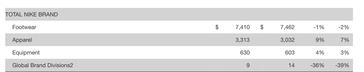 分品牌来看,耐克品牌该季度营收为113.62亿美元,在报告基础上同比增长2%,在汇率不变基础上计算持平。其中,耐克品牌的服饰和设备品类在汇率不变基础上分别同比增长7%和3%。分渠道来看,耐克品牌的经销收入为68亿美元,在汇率不变基础上同比增长5%。